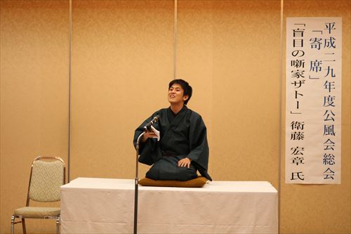 閉会後、盲目の噺屋 ザトーこと衛藤宏章氏に大分弁落語を披露して頂きました。参加者は衛藤さんの巧みな話術に引き込まれ終始笑いの絶えない時間を過ごしました。