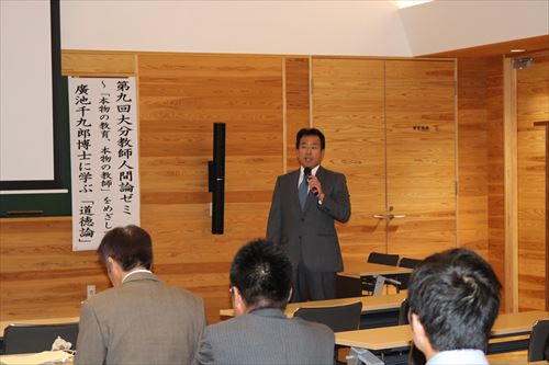 大分教師人間論ゼミでは、中村高志執行委員長が廣池千九郎先生の生涯を辿りました。廣池先生は、14歳で補助教員となり、19歳で正規教員となってからは、教育の必要性を訴え、「夜間学校」設立を果たしました。また「実学尊重」の精神に立って、社会に役立つ教育を実践し、現在の技術家庭科設置に尽力されました。学校改革を進める傍ら、道徳教育の副読本「新編小学修身用書」も編纂されています。廣池先生の72歳の生涯からその道徳観がどのように形成されていったのか知ることができました。また教員の待遇改善、優秀な人材確保のため大分県教員互助会を全国に先駆けて設立するなど現在の大分県公高教の活動に通じるものを感じました。